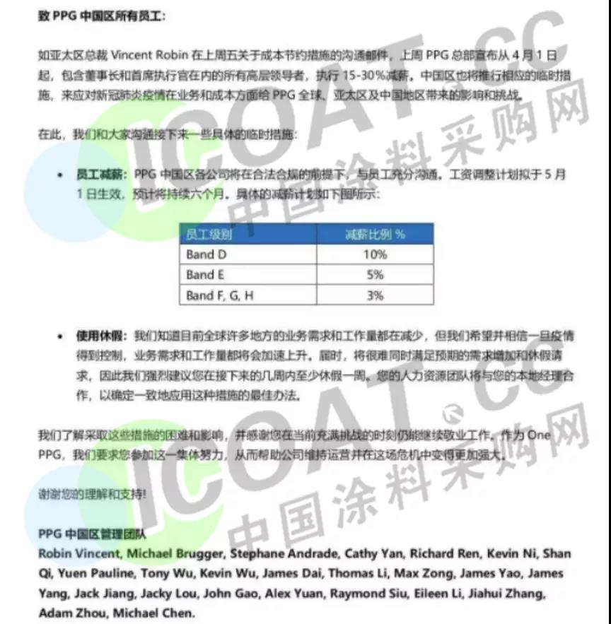 由于汽車行業的衰落,也影響到了上游涂料供應商,據涂料采購網了解,近期,PPG、巴斯夫等涂料知名企業也動作頻頻。PPG宣布,已批準重大且廣泛的重組計劃,當這些計劃完成后,預計每年將節省1.6-1.7億美元的稅前成本,該計劃包括美國和加拿大提供的自愿離職計劃,關閉部分工廠和分銷業務,對受需求影響最嚴重的企業實行臨時員工休假等。此前,PPG總裁在關于成本節約措施的郵件中表示,包含董事長和首席執行掛在內的所有高層領導者,執行15-30%減薪。執行D級員工減薪10%,E級員工減薪5%,F/G/H級員工減薪3%的措施。