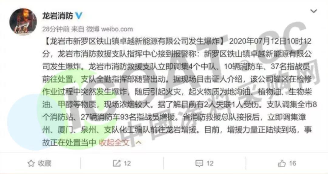 龍巖市消防救援支隊調集全市34輛消防車、136名指戰員增援。此外,福建省消防救援總隊已調派廈門、漳州、泉州支隊的化工編隊前往增援。爆炸還對周邊部分基站造成影響,目前火災正在處置中。火災原因已啟動調查程序。