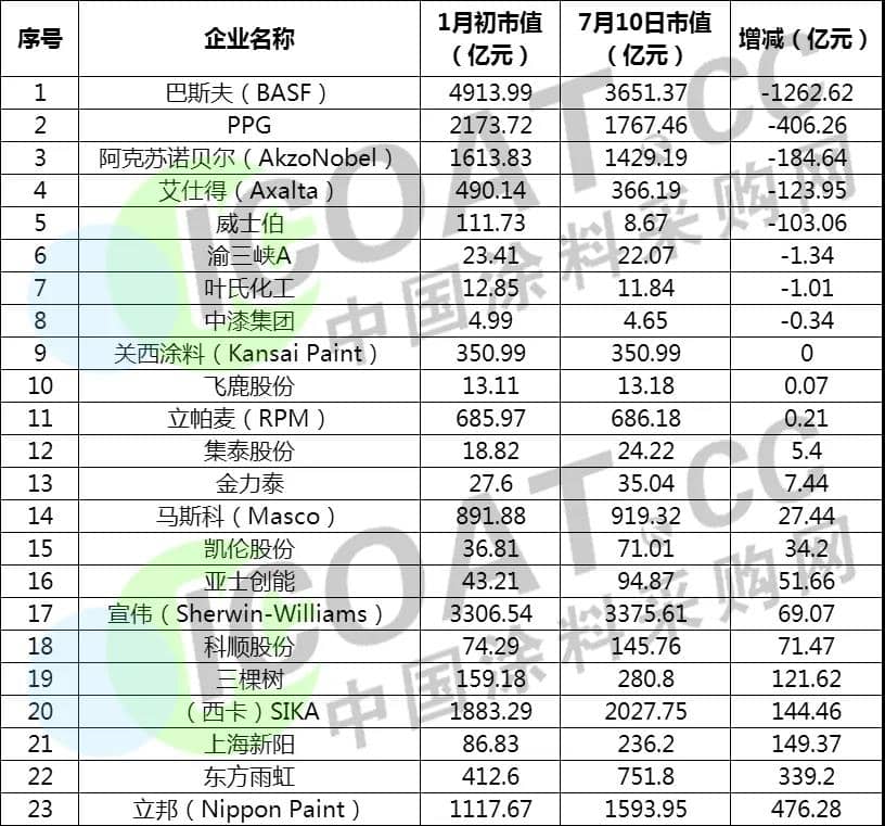 2020年以來,全球涂料企業(yè)除了業(yè)績(jī)下滑,市值也出現(xiàn)了大幅度縮水,巴斯夫前7個(gè)月市值縮水1262.62億元,PPG市值縮水406.26億,阿克蘇諾貝爾市值縮水184.64億,艾仕得市值縮水123.95億。全球重量級(jí)涂料上市企業(yè)市值縮水情況如下: