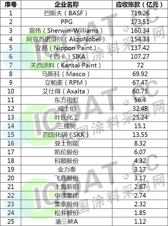 從應(yīng)收賬款來看,2019年全球五大涂料集團(tuán)的應(yīng)收賬款在所有的上市企業(yè)當(dāng)中是最高的,比如巴斯夫應(yīng)收賬款高達(dá)719.26億,PPG應(yīng)收賬款達(dá)173.51億,宣偉應(yīng)收賬款160.34億,阿克蘇諾貝爾應(yīng)收賬款154.33億。