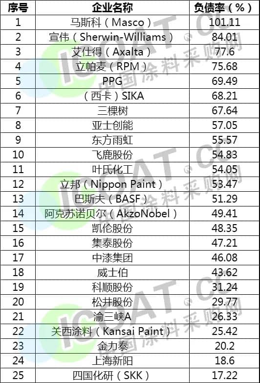 從全球部分涂料上市企業(yè)的負(fù)債率來看,馬斯科的負(fù)債率高達(dá)101.11%,據(jù)涂料采購(gòu)網(wǎng)了解,馬斯科是世界領(lǐng)先的材料及涂料生產(chǎn)和銷售商,在美涂料市場(chǎng)占有率達(dá)70%,但是自2015年以來,馬斯科的負(fù)債率每年都在100%以上;從近幾年的發(fā)展軌跡來看,馬斯科、宣偉、艾仕得等涂料企業(yè)的負(fù)債率并沒有明顯的變化,基本保持平衡。