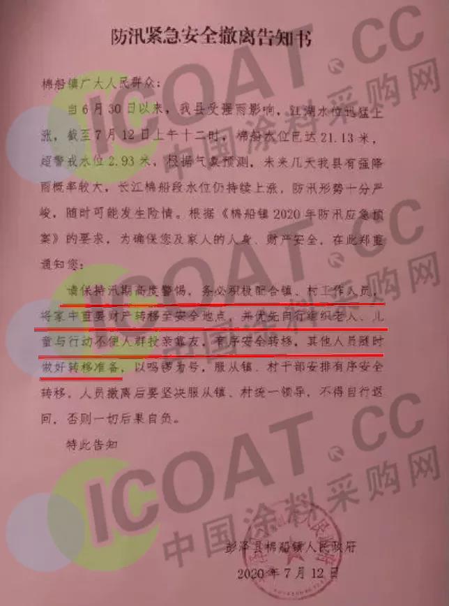 彭澤縣棉船鎮發布告知書,要求當地群眾高度警惕,積極配合將家中重要財產轉移至安全地點,有限組織老人、兒童與行動不便人群有序安全轉移,其他人員隨時做好轉移準備,人員撤離后要堅決服從領導,不得自行返回。