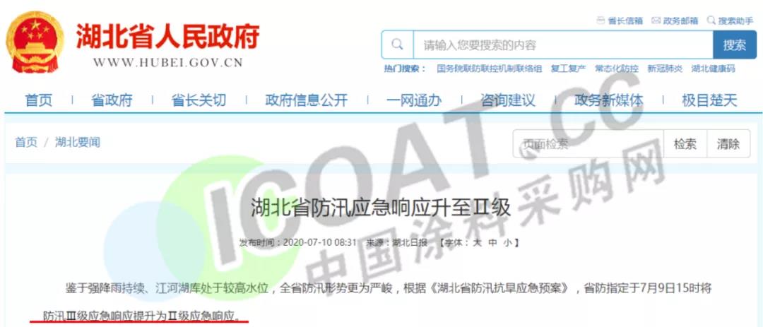 7月12日18時,洪湖市防汛抗旱指揮部辦公室將防汛應急響應由Ⅱ級提至I級,全市進入緊急防汛期。目前湖北省已有武漢蔡甸、黃石陽新、荊州洪湖三個縣市區防汛應急響應提至I級。