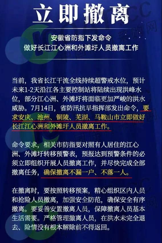 安徽省防指下發命令,做好長江江心洲和外灘圩人員撤離工作,要求7月14日前,安慶、池州、銅陵、蕪湖、馬鞍山市做好人員撤離工作,確保撤離不漏一戶,不落一人。