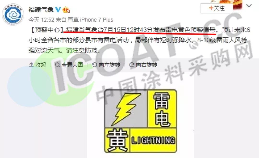 福建省氣象臺7月15日12時43分發布雷電黃色預警信號。