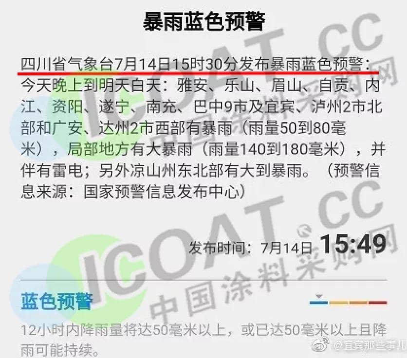 7月14日下午,四川省氣象臺發布暴雨藍色預警。