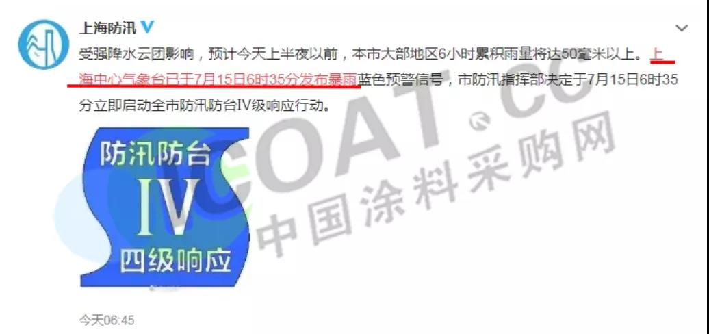 7月15日6時35分發布暴雨藍色預警信號,市防汛指揮部決定于7月15日6時35分立即啟動全市防汛防臺Ⅳ級響應行動。