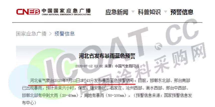 河北省氣象臺2020年7月12日2時43分發布暴雨藍色預警信號。