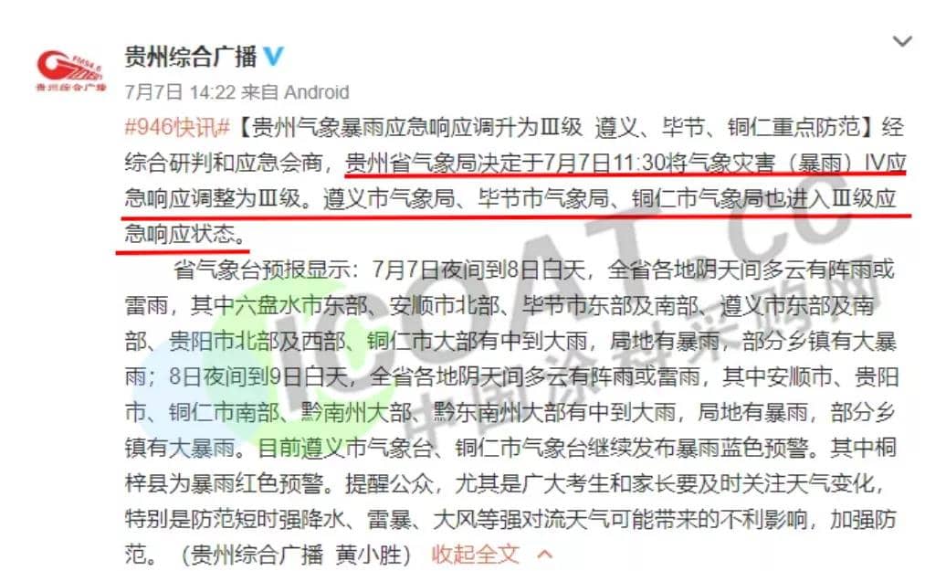 暴雨應急響應提升為III級,遵義、畢節、銅仁重點防范。