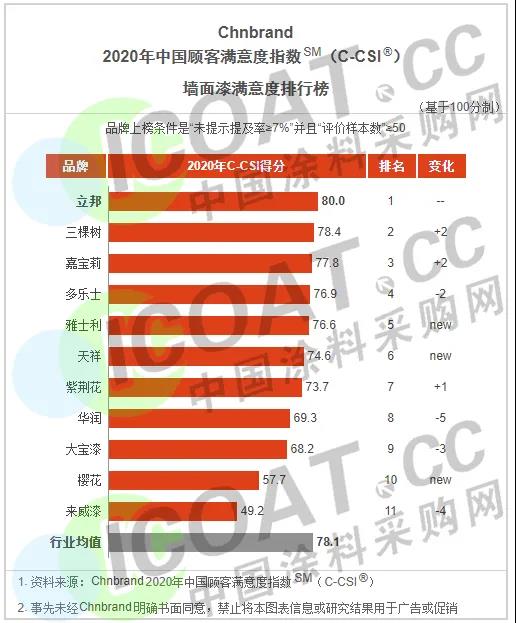 在墻面漆滿(mǎn)意度排行榜中,前三名分別是立邦、三棵樹(shù)、嘉寶莉,分?jǐn)?shù)為80.0分、78.4分和77.8分(基于100分制),其中立邦連續(xù)4年位居第一。