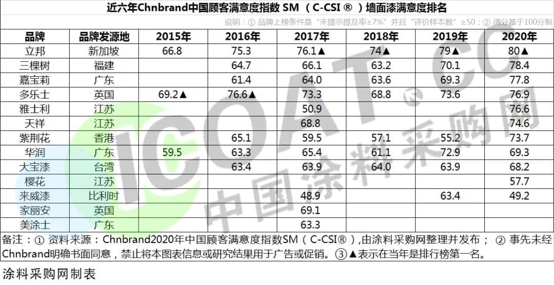 根據(jù)以上數(shù)據(jù)可以看出,立邦、多樂(lè)士、華潤(rùn)三個(gè)品牌自C-CSI開(kāi)始第一年便榮幸上榜,保持著六年在榜的優(yōu)秀戰(zhàn)績(jī),最高分分別為80.0分,76.9分,69.3分,且均出現(xiàn)在2020年。