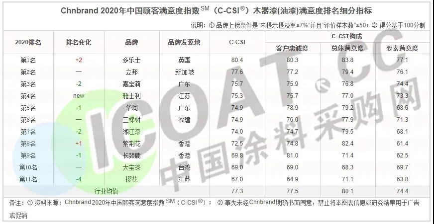 從上表可以看出,多樂(lè)士較2019年上升兩個(gè)名次,超過(guò)了立邦和嘉寶莉,成為2020年的中國(guó)顧客滿(mǎn)意度指數(shù)最高的企業(yè),而2019年位于榜首的嘉寶莉,則只能屈居第三了。除此之外,較2019年相比,紫荊花客戶(hù)滿(mǎn)意度有所上升,而華潤(rùn)、湘江漆、長(zhǎng)頸鹿、櫻花四大品牌的客戶(hù)滿(mǎn)意度較2019年有所下滑。