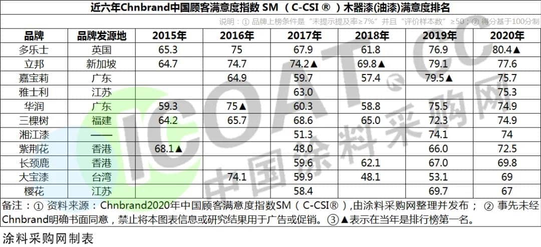 涂料采購(gòu)網(wǎng)通過(guò)數(shù)據(jù)整合,將2015年至今6年時(shí)間內(nèi)木器漆(油漆)滿(mǎn)意度排名情況做了匯總,可以看出在木器漆(油漆)品類(lèi)眾多品牌的排行榜變化。
