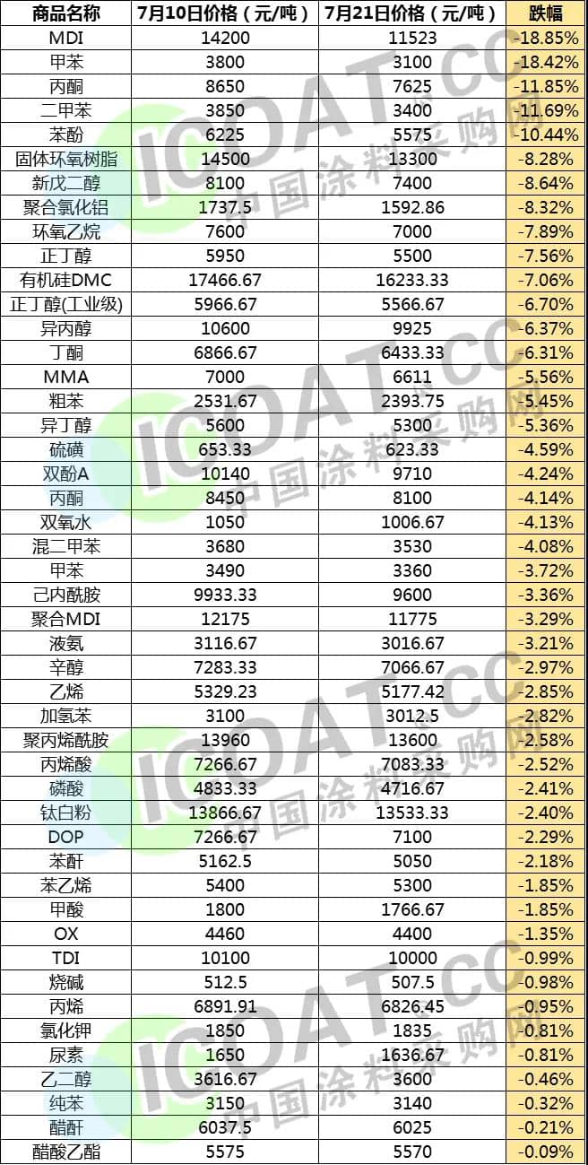據(jù)涂料采購(gòu)?fù)〝?shù)據(jù),多個(gè)企業(yè)MDI報(bào)價(jià)下跌。7月21日,臨沂三通化工有限公司萬(wàn)華料報(bào)價(jià)11800元/噸,較15日下跌200元/噸,上海料報(bào)價(jià)11500元/噸,較15日下跌200元/噸;廣州博順化工有限公司萬(wàn)華料報(bào)價(jià)11800元/噸,較15日下跌200元/噸,上海料報(bào)價(jià)11500元/噸,較15日下跌100元/噸;山東博蘇新材料有限公司萬(wàn)華料報(bào)價(jià)12000元/噸,較15日下跌600元/噸,上海料報(bào)價(jià)11700元/噸,較15日下跌400元/噸。