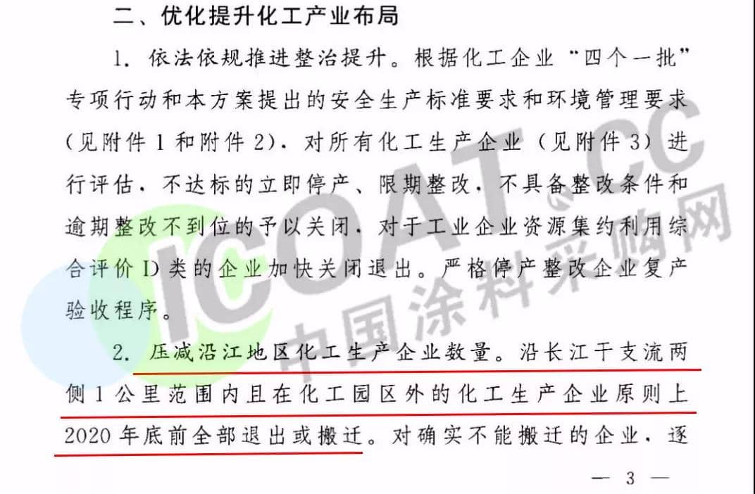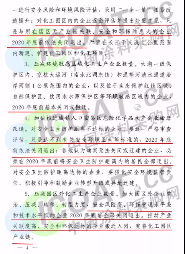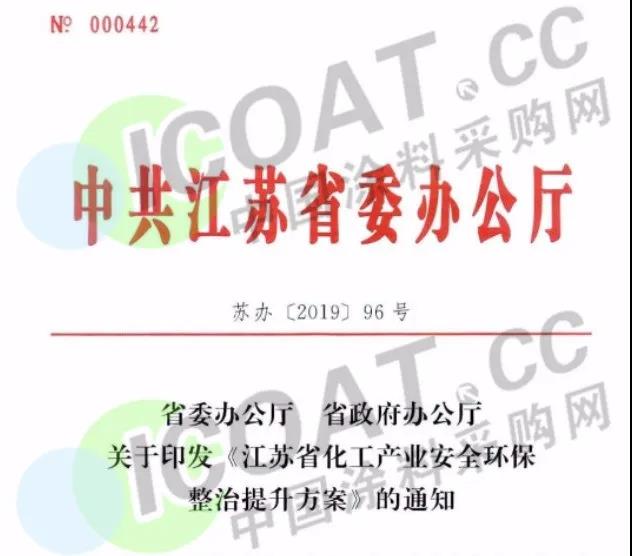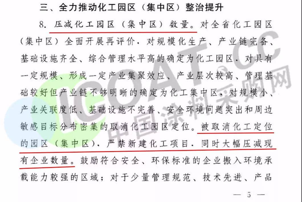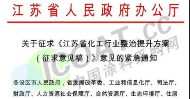 據(jù)涂料采購網(wǎng)了解,響水爆炸事故之后,江蘇省人民政府辦公廳2019年4月1日發(fā)布關(guān)于征求《江蘇省化工行業(yè)整治提升方案(征求意見稿)》(以下簡稱“意見稿”)。對(duì)未來五年之內(nèi),江蘇省化工企業(yè)、化工園區(qū)的改造升級(jí)及退出做出了明確指示。