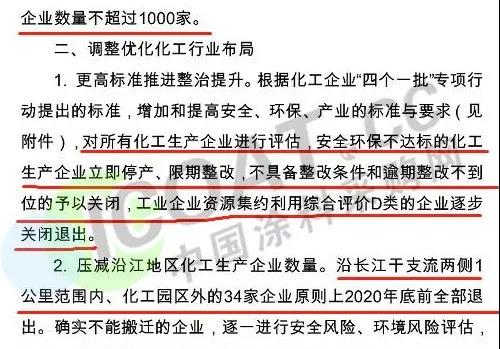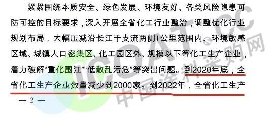 該方案指出,到2020年底,江蘇省化工生產(chǎn)企業(yè)數(shù)量減少到2000家,到2022年,全省化工生產(chǎn)企業(yè)數(shù)量不超過1000家;沿長江干支流兩側(cè)1公里范圍內(nèi)、化工園區(qū)外的34家企業(yè)原則上2020年底前全部退出;