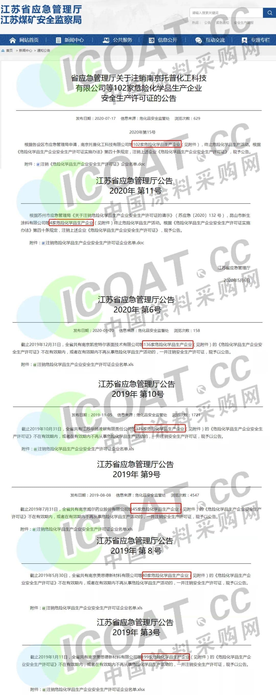 據(jù)涂料采購網(wǎng)獲悉,江蘇省應(yīng)急管理廳曾多次發(fā)布公告,對(duì)安全生產(chǎn)許可證注銷的危險(xiǎn)生產(chǎn)企業(yè)進(jìn)行公告,近幾年累計(jì)注銷近千家。