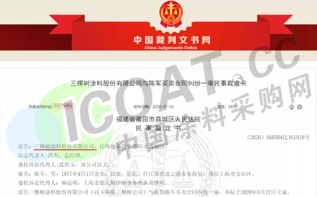 然而,據涂料采購網了解,在福建省莆田市荔城區人民法院作出(2020)閩0304民初1916號裁定之前,早在2020年4月29日,三棵樹涂料股份有限公司向福建省莆田市荔城區人民法院申請訴前財產保全,對被申請人陳軍名下的中國工商銀行股份有限公司上海市春申支行的帳號62XXX25內的存款335000元提供擔保。