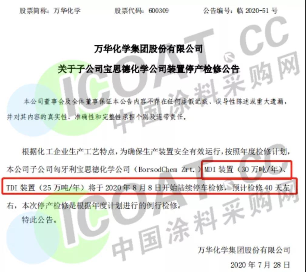 疊加近日巴斯夫宣布其位于路易斯安那州蓋斯馬爾的產(chǎn)能為16萬(wàn)噸/年的甲苯二異氰酸酯(TDI)工廠遭遇不可抗力,對(duì)于正常生產(chǎn)也會(huì)造成影響。業(yè)內(nèi)人士表示,目前國(guó)內(nèi)MDI、TDI的需求正在不斷增加,檢修加劇了原料市場(chǎng)的供應(yīng)緊張,但圈內(nèi)龍頭企業(yè)的停車(chē)檢修讓市場(chǎng)看漲氣氛濃厚。