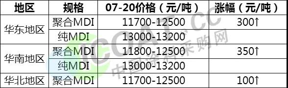 不少企業(yè)MDI封盤(pán),華東地區(qū)聚合MDI報(bào)價(jià)上調(diào)300元/噸,華東地區(qū)聚合MDI報(bào)價(jià)上調(diào)350元/噸,華北地區(qū)聚合MDI報(bào)價(jià)上調(diào)100元/噸。
