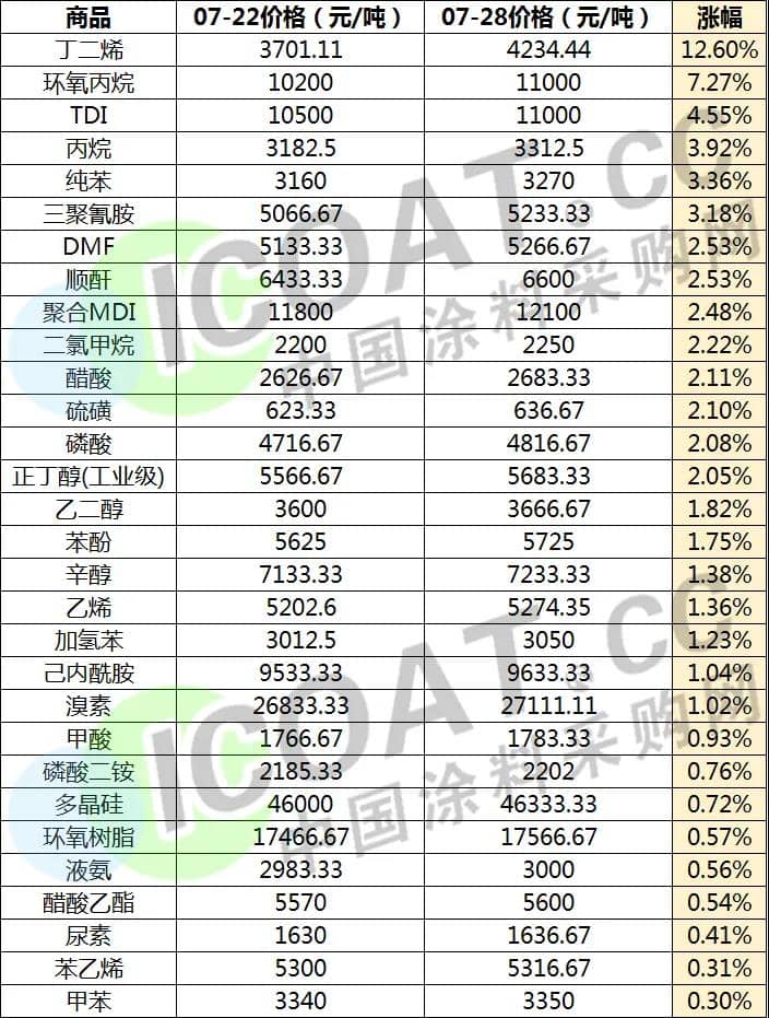 據(jù)涂料采購(gòu)網(wǎng)不完全統(tǒng)計(jì),在較為重要的84種化工原材料中,有30種處于上漲趨勢(shì),其中丁二烯(12.6%)、環(huán)氧丙烷(7.27%)、TDI(4.55%)位于漲幅榜前三位,丙烷、純苯、三聚氰胺、聚合MDI等27種原材料漲幅在5%以下。