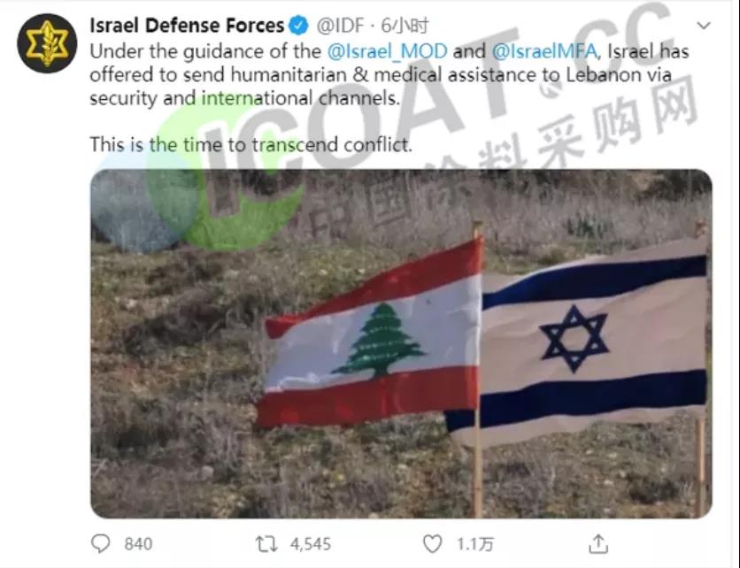 以色列國防部發文表示,以色列已提出通過安全的國際渠道向黎巴嫩提供人道主義和醫療援助。