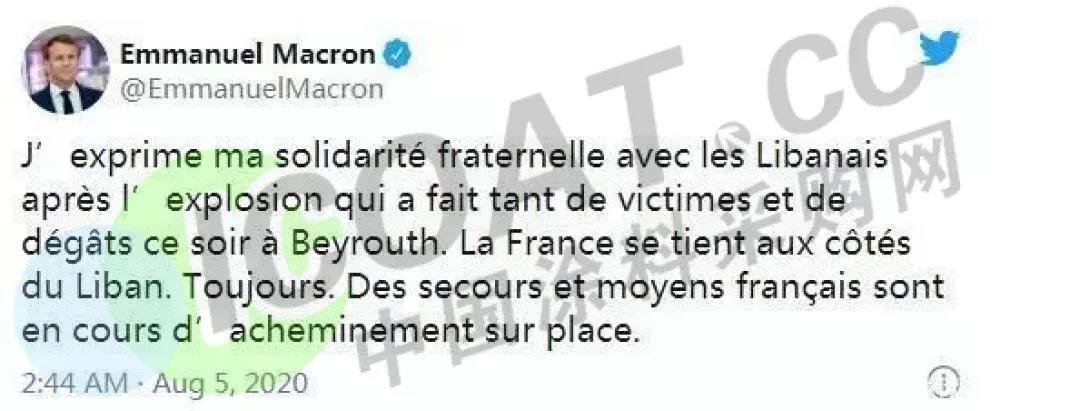 法國總統馬克龍發推表達了對黎巴嫩民眾的支持,并表示法國正在向黎巴嫩提供援助。馬克龍在推特上寫道:“今晚貝魯特發生爆炸,造成很多傷亡及破壞,我向黎巴嫩致以兄弟般的聲援。法國與黎巴嫩同在,一直如此。法國的援助和資源正在運往(爆炸)地點。”