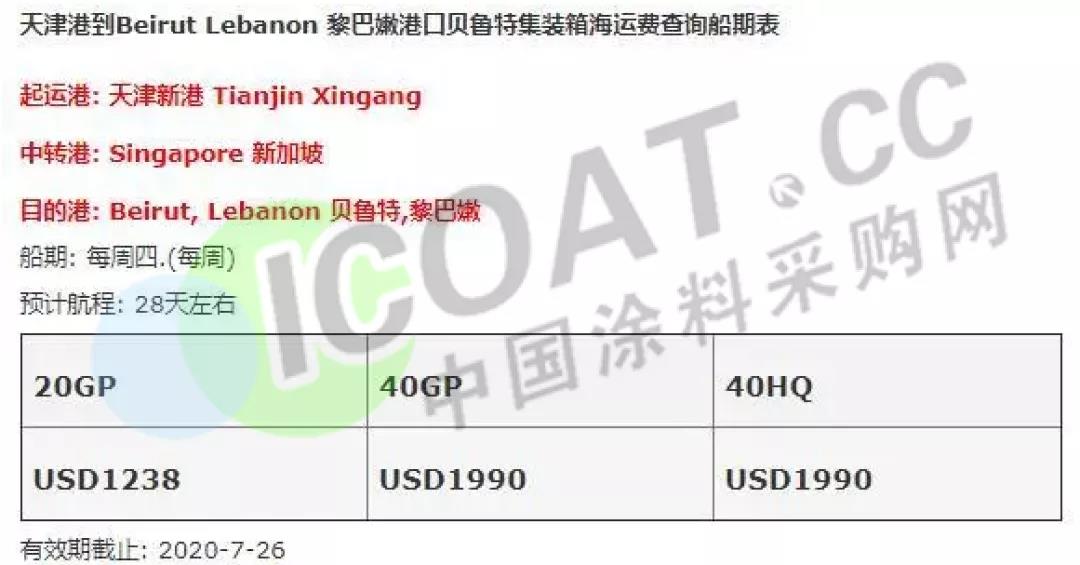 此外,記者還發現,從天津新港有到貝魯特的航線,航程大概在一個月左右,而價格也并不相同,其中20GP的小柜價格為1238美元,約合8600人民幣,40GP與40HQ的大柜與高柜價格均為1990美元,約合13800人民幣。