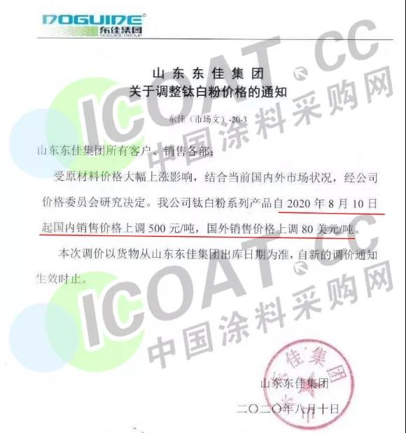 8月10日,山東東佳集團(tuán)發(fā)布調(diào)價函,稱自8月10日起,鈦白粉系列產(chǎn)品國內(nèi)銷售價格上調(diào)500元/噸,國外銷售價格上調(diào)80美元/噸。此前在7月10日,山東東佳集團(tuán)曾發(fā)布調(diào)價函,稱7月10日起國內(nèi)銷售價格上調(diào)500元/噸,國外銷售價格上調(diào)80美元/噸。也就是說,下半年山東東佳集團(tuán)鈦白粉產(chǎn)品,國內(nèi)銷售價格累計(jì)上調(diào)1000元/噸,國外銷售價格累計(jì)上調(diào)160美元/噸。