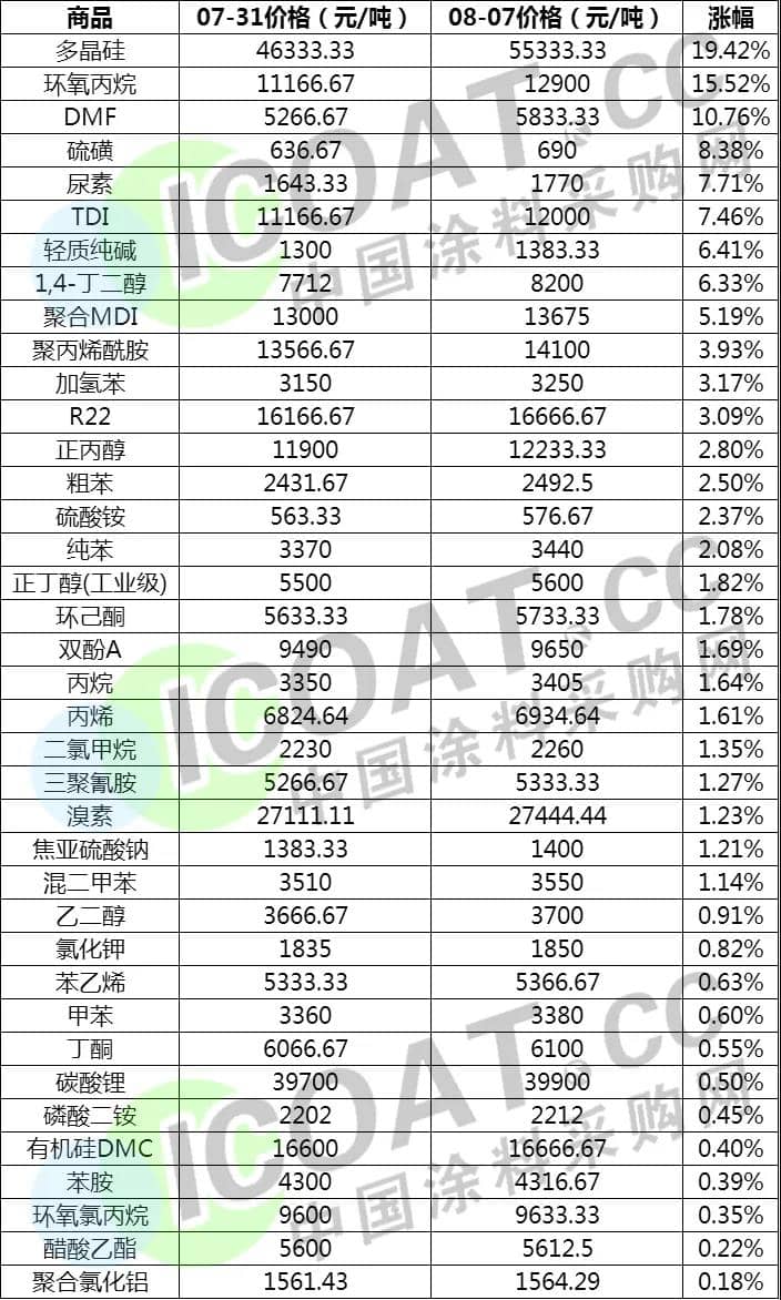 另據(jù)涂料采購網(wǎng)不完全統(tǒng)計(jì),在85種重要的化工原材料中,有38種原材料出現(xiàn)漲幅,占比44.71%。漲幅榜前三名分別為多晶硅(19.42%),環(huán)氧丙烷(15.52%),DMF(10.76%)。TDI,粗苯、雙酚A等35種原材料漲幅在10%以下。