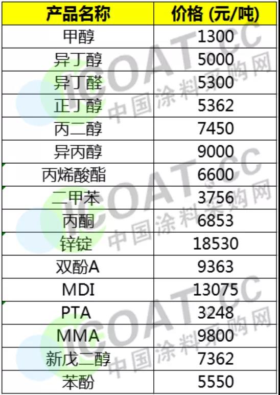 同時,徽州區(qū)循環(huán)經(jīng)濟(jì)園內(nèi)部分企業(yè)停車或降負(fù),也帶動了環(huán)氧樹脂的漲價,目前黃山地區(qū)部分固體環(huán)氧樹脂企業(yè)報價上調(diào)500元/噸至14500元/噸。華東液體樹脂報價16500元/噸,部分企業(yè)報價上調(diào)近500元/噸。除環(huán)氧樹脂和TGIC以外,據(jù)涂料采購網(wǎng)不完全統(tǒng)計(jì),近期不少原材料出現(xiàn)異動,價格直線走高。