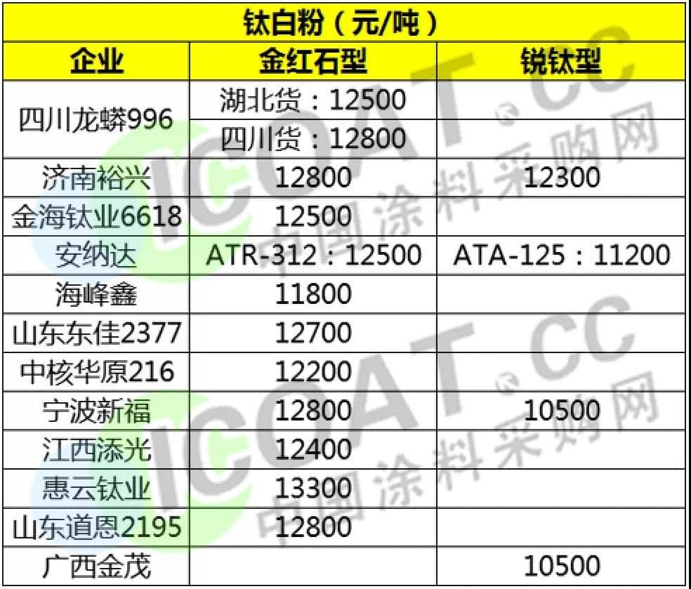 據(jù)涂料采購網(wǎng)了解,自8月4日起,眾多鈦白粉企業(yè)的漲價函紛至沓來,內(nèi)貿(mào)價格漲幅在500元/噸,外貿(mào)價格漲幅在80美元/噸左右,且道恩鈦業(yè)、金茂鈦業(yè)、鈦海科技、創(chuàng)大玉兔、鈦都科技等企業(yè)均是下半年第二輪漲價,累計(jì)漲幅高達(dá)1000-1200元/噸,其中創(chuàng)大玉兔生產(chǎn)的“玉兔”牌鈦白粉累計(jì)漲價1200元/噸。