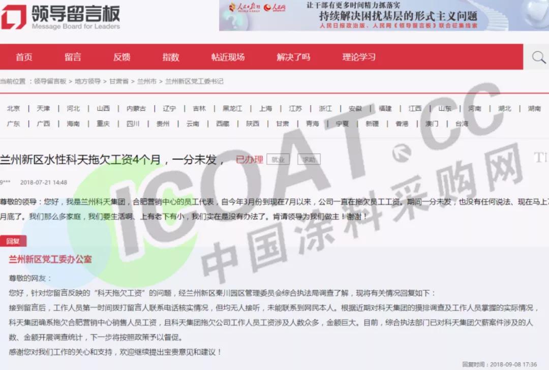 另一蘭州科天集團合肥營銷中心的員工表示,自3月份至7月份,該企業一直拖欠員工工資,期間一分未發,也沒有任何說法。蘭州新區黨委工位辦公室的回復稱,科天集團確系拖欠合肥營銷中心銷售人員工資,且拖欠工作人員工資涉及人數眾多,金額巨大。