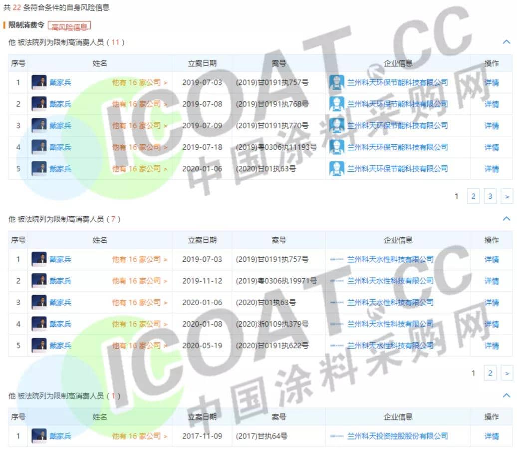 2020年5月19日,蘭州新區人民法院對水性科天負責人戴家兵采取了限制消費措施。
