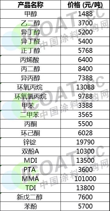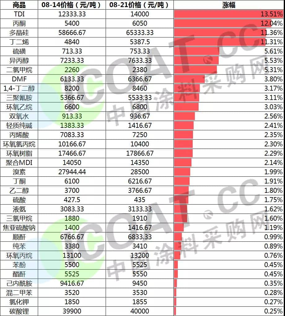 位于榜首的TDI漲幅驚人,據涂料采購網了解,近期,外盤裝置變動較為頻繁,涉及總產能達341萬噸,整體來說全球開工率大幅下降。繼萬華化學、巴斯夫先后宣布提高MDI掛牌價后,滄州大化、陶氏大幅提升TDI價格再次引起市場關注。業內人士表示此輪TDI漲價的核心邏輯在于廠商因庫存壓力較小向上抬價,這種趨勢或將延續至9月份。