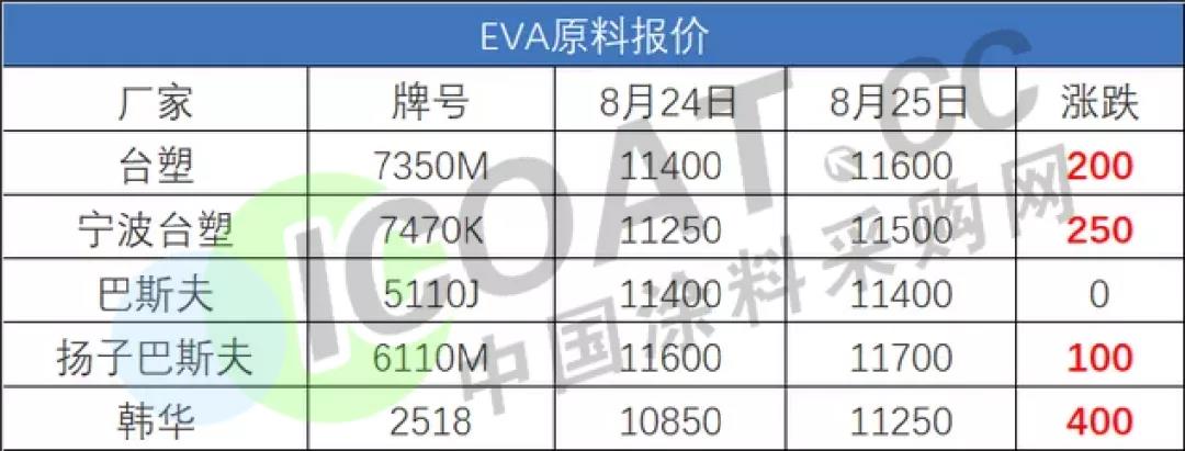 颶風和熱帶風暴導致美國油氣減產,國際油價反彈。EVA價格部分上揚,生產企業出廠價繼續調漲,然終端需求乏力,市場交投受限,EVA市場或以消化漲幅為主。部分進口料現貨偏緊局面難改,推漲市場報價上探,25日,臺塑7350M價格上漲200元/噸,寧波臺塑7470K價格上漲250元/噸,揚子巴斯夫6110M價格上漲100元/噸,韓華2518價格上漲400元/噸。