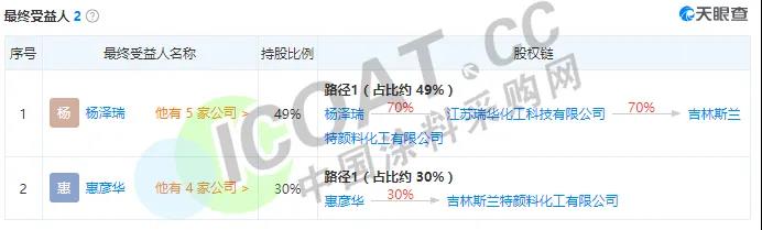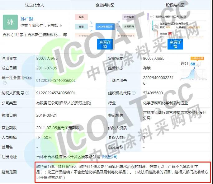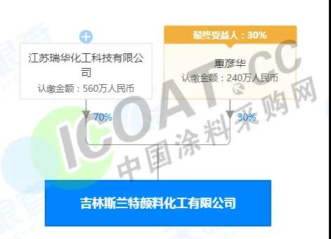 據(jù)涂料采購網(wǎng)了解,吉林斯蘭特顏料化工有限公司注冊資本800萬人民幣,其股東江蘇瑞華化工科技有限公司持股70%,另一股東惠彥華持股30%,為該企業(yè)的最終受益人(另一最終受益人楊澤瑞持股比例49%)。