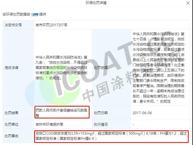 另外,吉林斯蘭特顏料化工有限公司于2017年6月6日被吉林市環(huán)境保護局罰款2347.8元,處罰事由為“總排口COD排放濃度為3.59×103mg/l,超過國家規(guī)定標準(500mg/l)6.18倍;PH值為1.2,超過國家規(guī)定標準(國家規(guī)定標準PH值6-9)”。