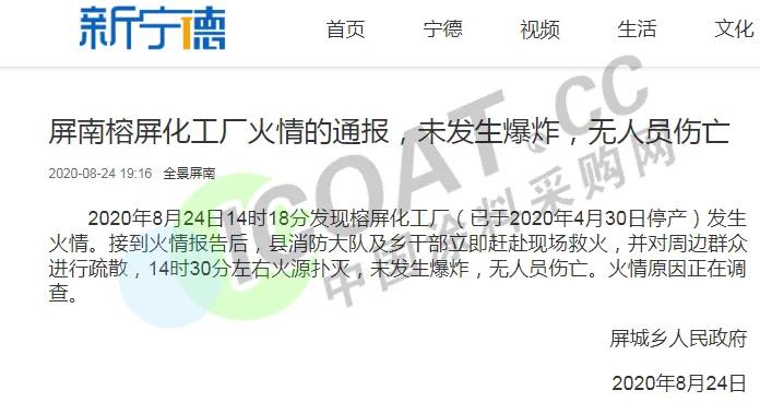 8月24日,榕屏化工廠(已于2020年4月30日停產(chǎn))發(fā)生火情,無人員傷亡,火情原因正在調(diào)查。