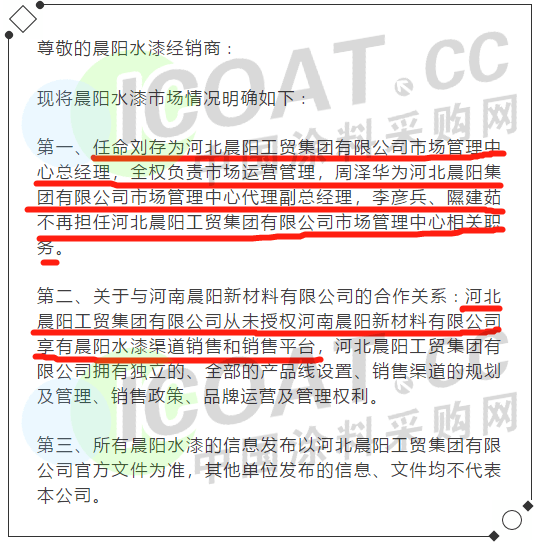 第二、關(guān)于與河南晨陽新材料有限公司的合作關(guān)系:河北晨陽工貿(mào)集團有限公司從未授權(quán)河南晨陽新材料有限公司享有晨陽水漆渠道銷售和銷售平臺,河北晨陽工貿(mào)集團有限公司擁有獨立的、全部的產(chǎn)品線設置、銷售渠道的規(guī)劃及管理、銷售政策、品牌運營及管理權(quán)利。