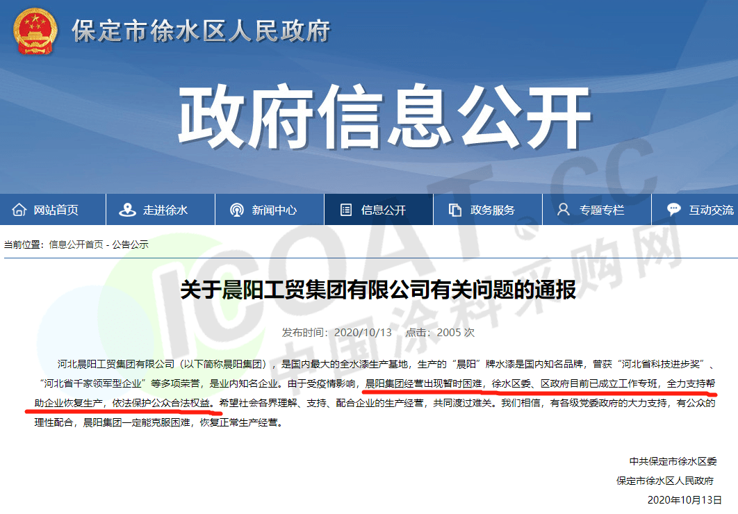 隨后,10月13日,保定市徐水區(qū)人民政府針對晨陽集團的相關(guān)問題發(fā)布了《關(guān)于晨陽工貿(mào)集團有限公司有關(guān)問題的通報》,通報稱:由于受疫情影響,晨陽集團經(jīng)營出現(xiàn)暫時困難,徐水區(qū)委、區(qū)政府目前已成立工作專班,全力支持幫助企業(yè)恢復生產(chǎn),依法保護公眾合法權(quán)益。希望社會各界理解、支持、配合企業(yè)的生產(chǎn)經(jīng)營,共同渡過難關(guān)。