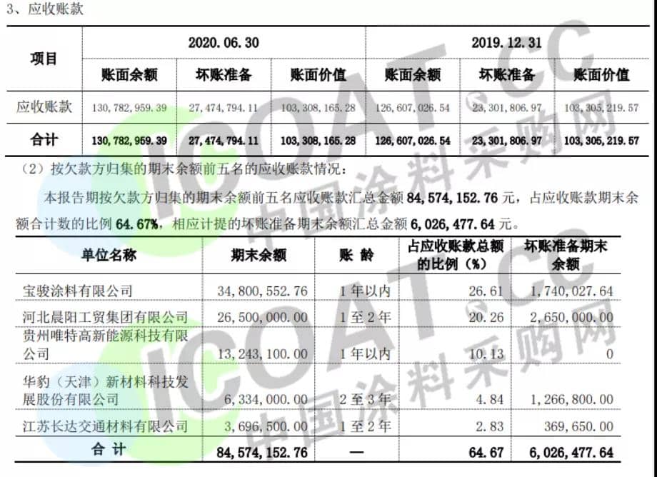 通過北京賽德麗2020年半年度報(bào)告可知,與其合作的客戶多為涂料行業(yè)和材料行業(yè),包括寶駿涂料、晨陽集團(tuán)、華豹等。其上半年度應(yīng)收賬款達(dá)到1.3億元。在應(yīng)收賬款前五名中,寶駿涂料欠款3480萬元,晨陽集團(tuán)欠款2650萬元,唯特高新能源科技欠款1324萬元,華豹欠款633萬元,江蘇長達(dá)交通材料欠款369萬元。