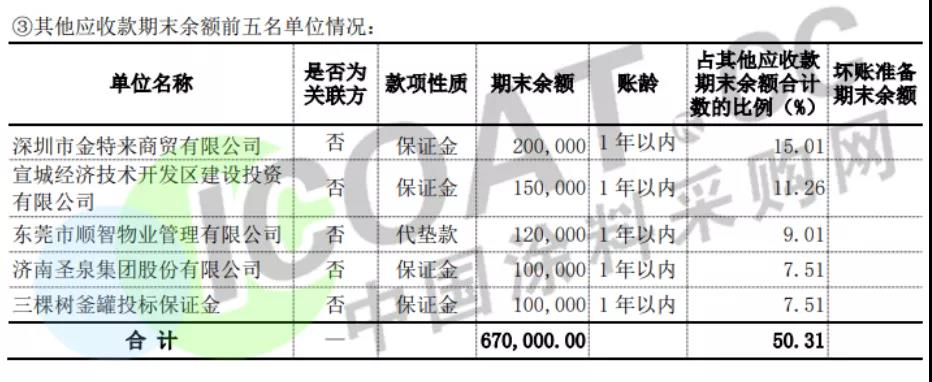 在其他應(yīng)收款方面,前五名中包含了三棵樹釜罐投標(biāo)保證金在內(nèi)的67萬元的保證金和代墊款。