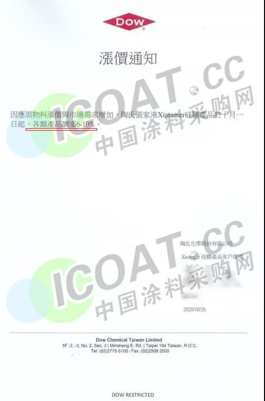 陶氏發(fā)布漲價(jià)通知,宣布張家港Xiameter硅膠產(chǎn)品于十月一日起,各類產(chǎn)品調(diào)漲6-10%。
