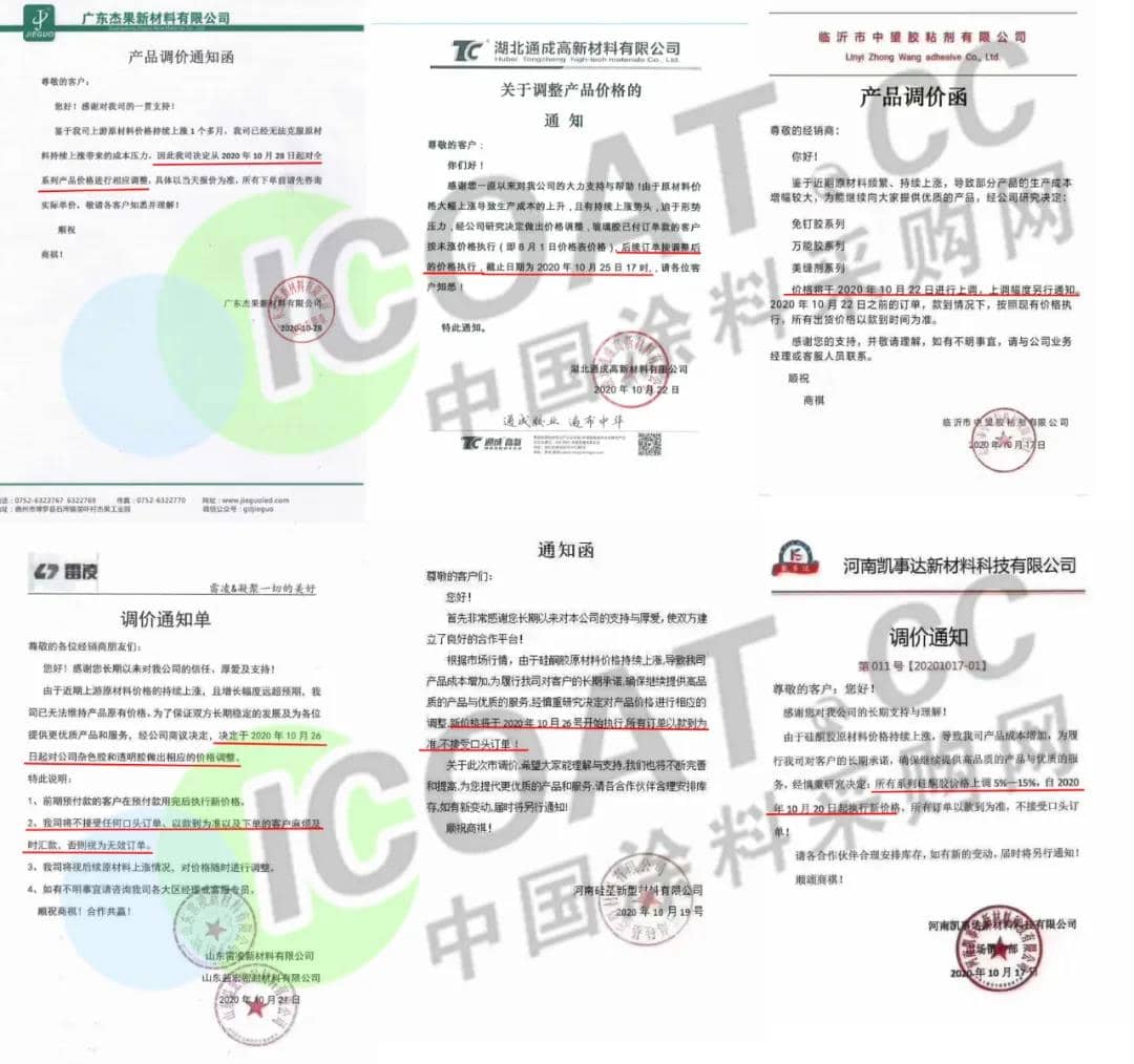硅酮膠市場幾乎到了價(jià)格一日一調(diào)的地步,企業(yè)紛紛宣布,貨物上漲5%-20%,訂貨前先確認(rèn)最新價(jià)格,訂單以到款為準(zhǔn),不接受任何口頭訂單。