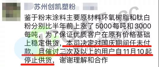 蘇州創(chuàng)凱塑粉表示,鑒于與粉末涂料主要原材料環(huán)氧樹脂和鈦白粉分別比半年前上漲了5000元/噸和3000元/噸,決定對(duì)國慶期間仍未付款,且催討二次及以上的用戶自11月10日起停止供貨。