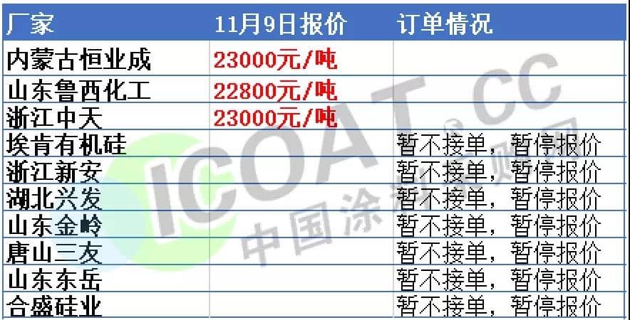據涂料采購網了解,9-11月為有機硅行業傳統旺季。從需求端來看,有機硅終端產品主要是硅橡膠(占比約66%)和硅油(占比約22%),硅橡膠需求以地產家居為主,硅油可應用于紡織助劑及公共衛生醫療等領域。漲價主要考慮海外公共衛生事件使國外有機硅生產受到較強沖擊導致整體開工率較低,同時下游需求旺盛所致,國道康寧、法國埃肯等有機硅中間體廠家降負運行,因此需求進入國內。成本端甲醇、氯甲烷、金屬硅價格均較為堅挺。