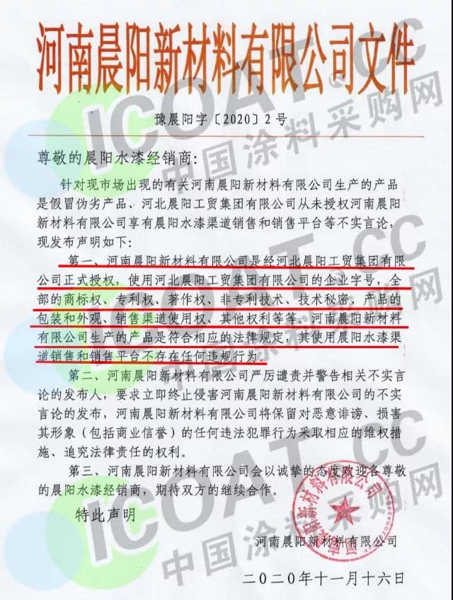 近日,河南晨陽新材料有限公司發(fā)布豫晨陽字[2020]2號(hào)文件稱,對(duì)于此前市場出現(xiàn)的其生產(chǎn)假冒偽劣產(chǎn)品及與河北晨陽工貿(mào)集團(tuán)有限公司之間的關(guān)系等言論發(fā)布聲明:河南晨陽新材料有限公司是經(jīng)河北晨陽工貿(mào)集團(tuán)有限公司正式授權(quán),使用河北晨陽工貿(mào)集團(tuán)有限公司的企業(yè)字號(hào),全部的商標(biāo)權(quán)、專利權(quán)、著作權(quán)、非專利技術(shù)、技術(shù)秘密、產(chǎn)品的包裝和外觀、銷售渠道使用權(quán)、其他權(quán)利等等。河南晨陽新材料有限公司生產(chǎn)的產(chǎn)品是符合相應(yīng)的法律規(guī)定,其使用晨陽水漆渠道銷售和銷售平臺(tái)不存在任何違規(guī)行為。