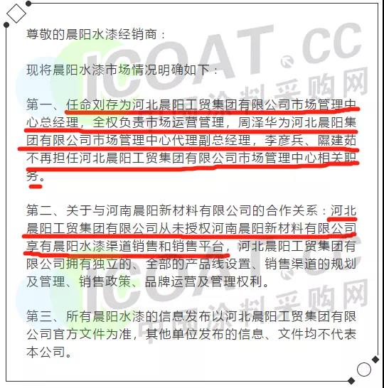 然而,就在一個(gè)月前,河北晨陽工貿(mào)集團(tuán)有限公司曾對(duì)河南晨陽新材料有限公司的合作關(guān)系作出聲明稱:河北晨陽工貿(mào)集團(tuán)有限公司從未授權(quán)河南晨陽新材料有限公司享有晨陽水漆渠道銷售和銷售平臺(tái),河北晨陽工貿(mào)集團(tuán)有限公司擁有獨(dú)立的、全部的產(chǎn)品線設(shè)置、銷售渠道的規(guī)劃及管理、銷售政策、品牌運(yùn)營及管理權(quán)利。