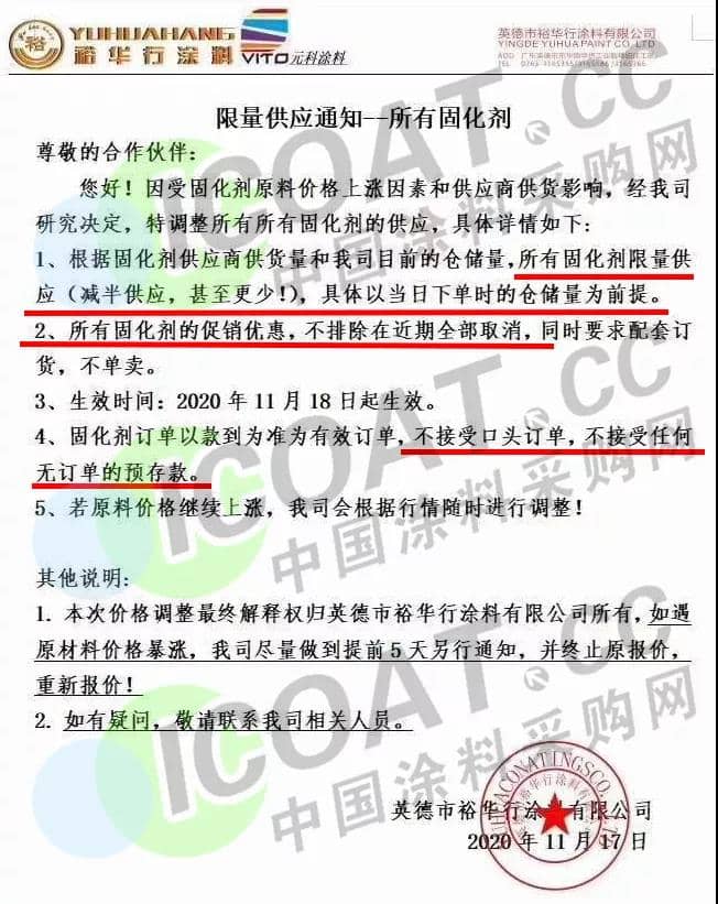 11月17日,英德市裕華行涂料有限公司發布通知稱:因受固化劑原材料價格上漲因素和供應商供貨影響,經研究決定,所有固化劑限量供應(減半供應,甚至更少),具體以當日下單時的倉儲量為前提。
